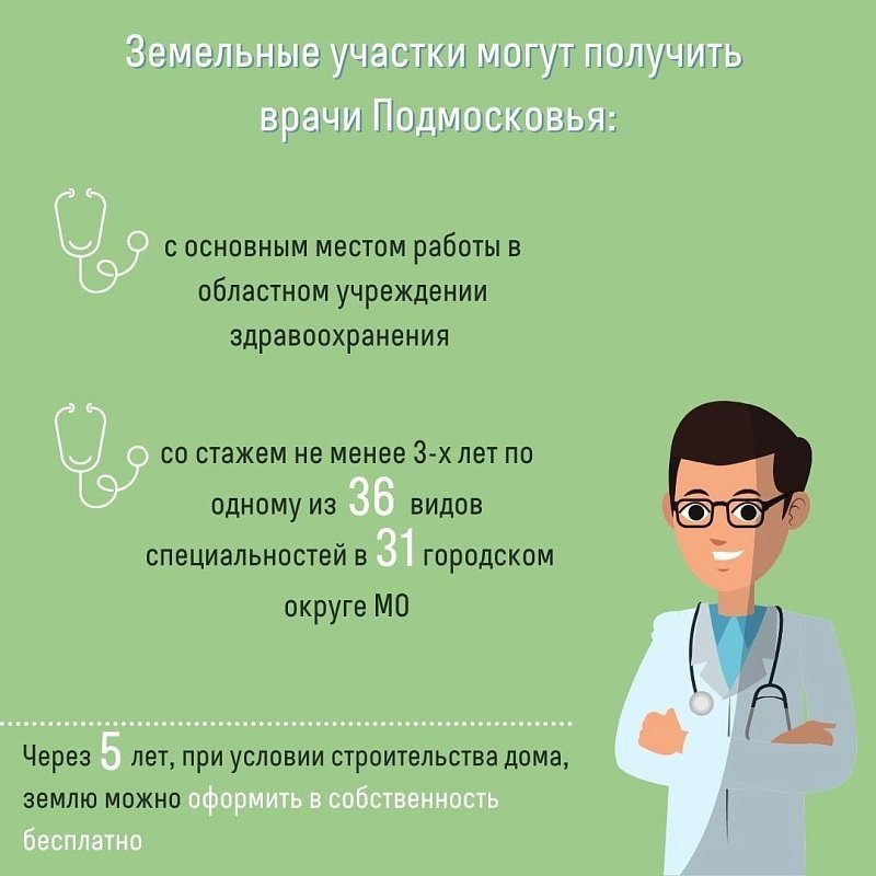 Согласно программе медики получают участки для индивидуального жилищного строительства или личного подсобного хозяйства сроком до 6 лет. Им не нужно платить аренду или земельный налог. А если они возведут дом, то через 5 лет смогут бесплатно оформить землю в собственность. Претендовать на землю могут врачи 36 узких специальностей, имеющие стаж не менее 3 лет в учреждениях здравоохранения Московской области. Все подробности - на mosreg.ru в разделах Документы/Нормотворчество/Законы (№ 144/2021).