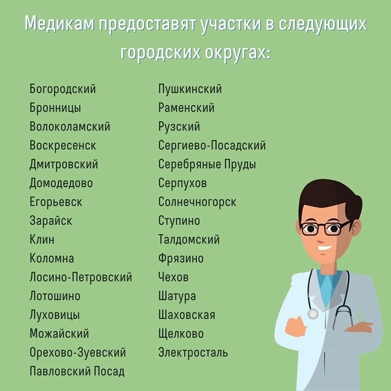 В Московской области также началась работа по созданию поселков для медиков. К октябрю их должны построить в Домодедово, Ступино, Сергиево-Посадском, Богородском округах. Благодаря реализации нового проекта участки смогут получить еще 542 врача.