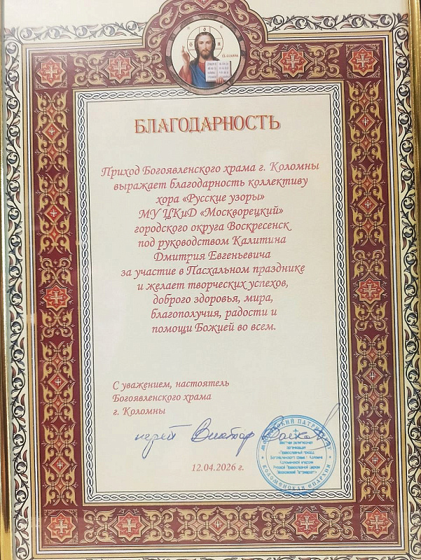 Хор «Русские узоры» ЦКиД «Москворецкий» под руководством Дмитрия Калитина по сложившейся доброй традиции принял участие в празднике, посвященном Светлой Пасхе, в приходе Богоявленского храма города Коломны.