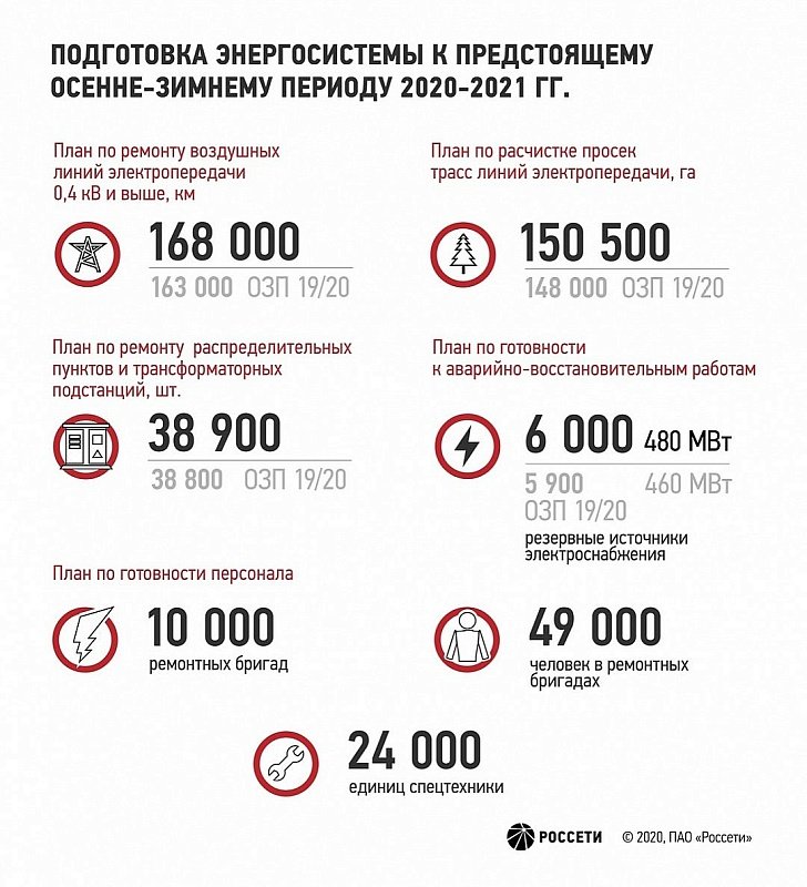 В 2020 году группа компаний «Россети» выполнит ремонт более 168 000 километров воздушных линий электропередачи 0,4 кВ и выше (в 2019 году - 163 000 км), 38 900 распределительных пунктов и трансформаторных подстанций (в 2019 - 38 800 шт.). В планах – расчистка более 150 500 гектаров просек трасс линий электропередачи (в 2019 - 148 000 га).