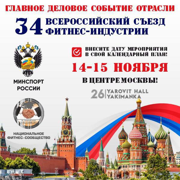 14-15 ноября 2024 года вся фитнес-отрасль России встретится на 34 Всероссийском съезде фитнес-индустрии. Организатор мероприятия: Национальное фитнес-сообщество при поддержке Министерства спорта Российской Федерации.