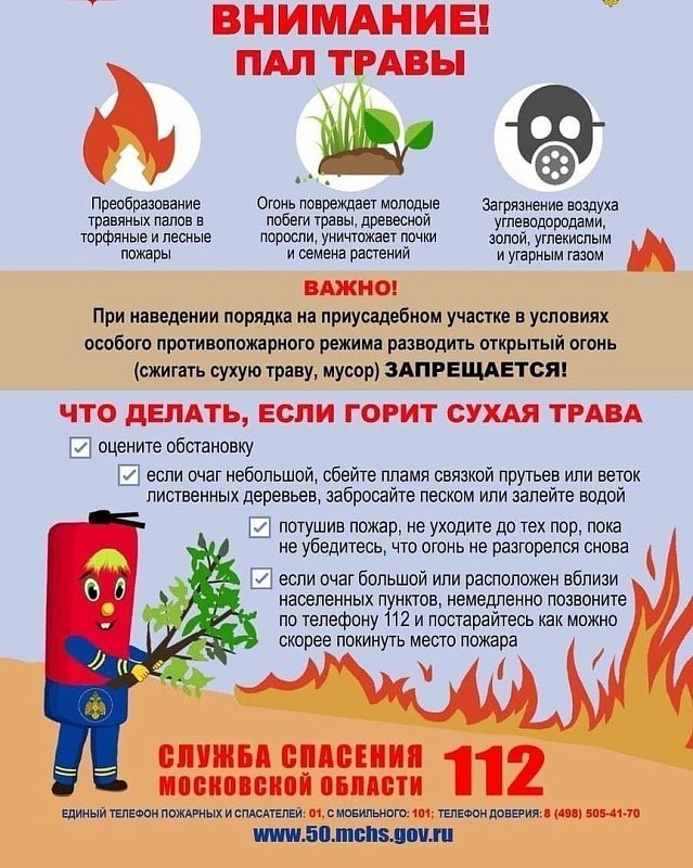 Главное управление МЧС России по Московской области напоминает об опасности пала сухой травяной растительности. В большинстве случаев источником их возникновения является человеческий фактор. При сильном ветре огонь может быстро распространиться на лесной фонд и населенные пункты. Жителям региона запрещается разводить открытый огонь, сжигать сухую траву и мусор, в том числе при наведении порядка на приусадебном участке.