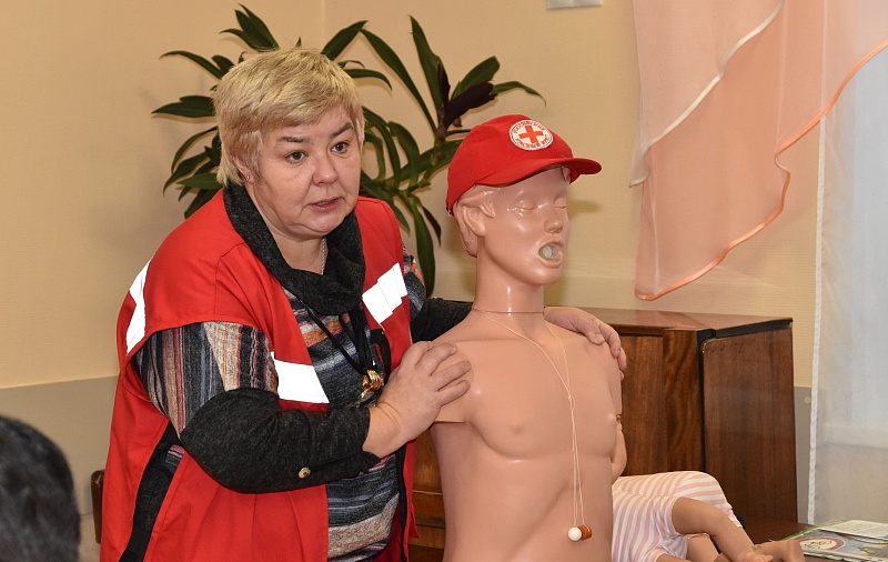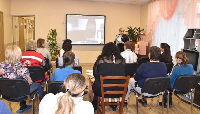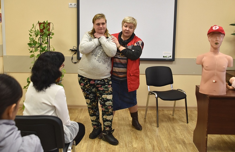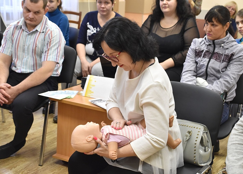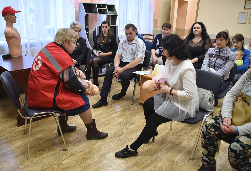 Председатель Воскресенского РОМО ООО «Российский Красный Крест» Т.Н. Воеводина продемонстрировала родителям практический курс по оказанию первой медицинской помощи детям.