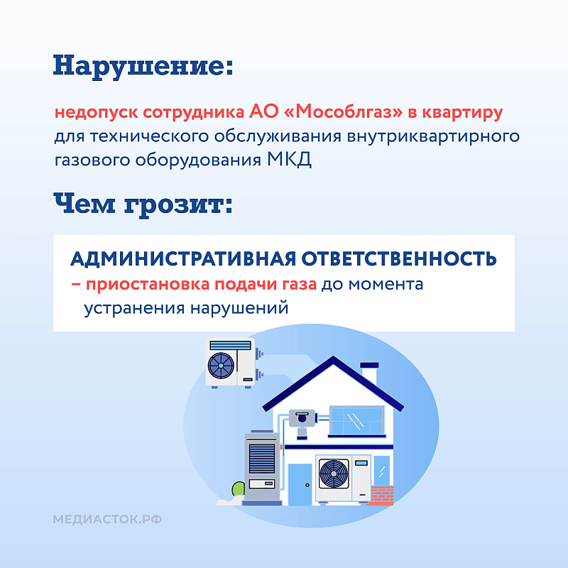 Ранее Вице-губернатор Московской области Владислав Мурашов отмечал, что главная цель профилактических проверок — не допустить несчастных случаев, связанных с неисправностью оборудования. Если житель дважды не обеспечивает проход ответственных служб в квартиру, ему грозит штраф в размере до 10 тыс. рублей. Эти крайние меры специалисты применяют исключительно в целях безопасности жизни и здоровья населения.
