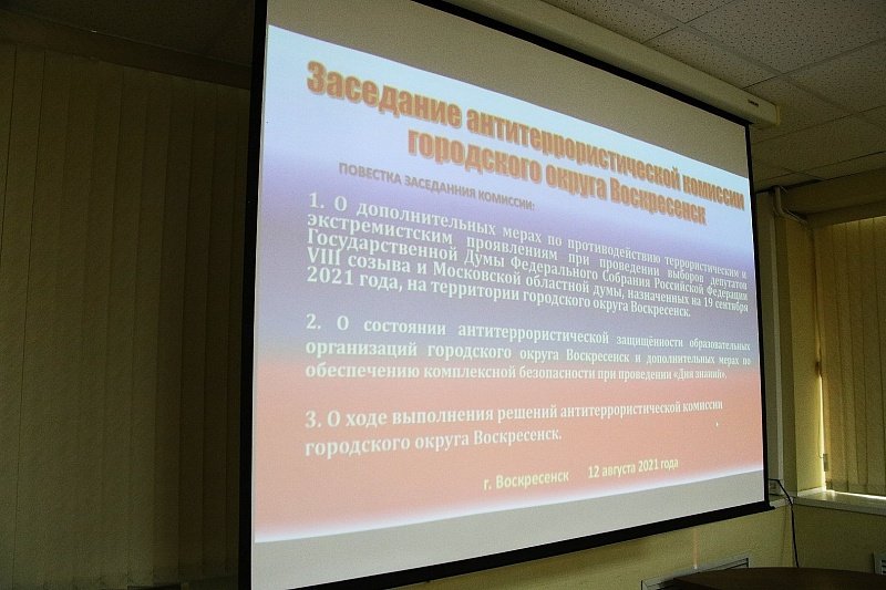 На заседании были рассмотрены вопросы обеспечения комплексной безопасности при проведении выборов депутатов Государственной Думы Федерального Собрания Российской Федерации VIII созыва и Московской областной думы на территории городского округа Воскресенск, «Дня знаний 1 сентября и «Дня солидарности в борьбе с терроризмом» 3 сентября 2021 года, подведены итоги исполнения решений антитеррористической комиссии округа.