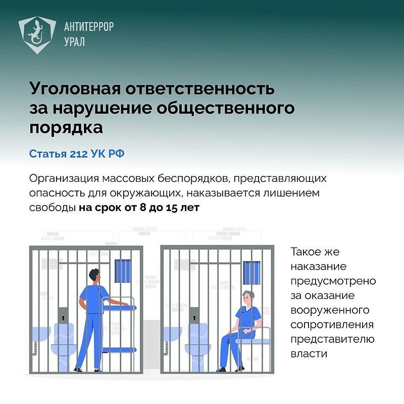 Антитеррористической комиссией в Свердловской области разработаны информационные карточки с рассказом о предусмотренной ответственности за осуществление массовых беспорядков.