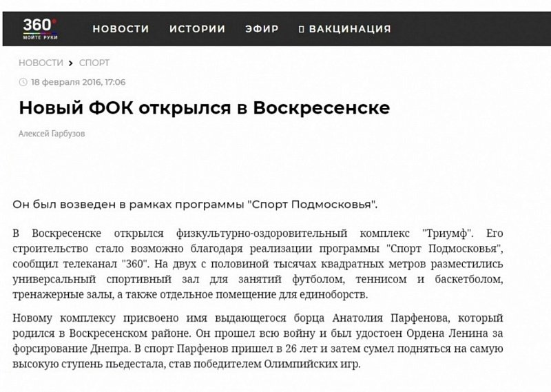Физкультурно-оздоровительный комплекс «Триумф» имени олимпийского чемпиона Анатолия Парфенова открылся в Воскресенске в 2016 году.