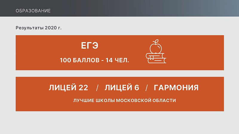В 2020 году по результатам ЕГЭ 14 выпускников 11-х классов получили высшую оценку – 100 баллов. Впервые в Воскресенске двое выпускников стали мультибалльниками. В прошлом году в число лучших школ Подмосковья вошли три воскресенских образовательных учреждения: лицей №22, лицей №6 и школа «Гармония».