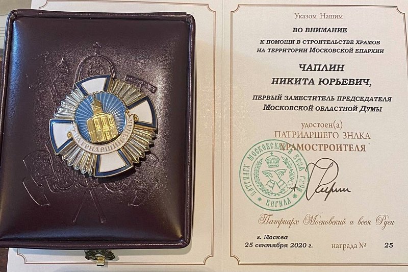 Святейший Патриарх Московский и всея Руси Кирилл совершил Божественную литургию в Патриаршем Успенском соборе Московского Кремля по окончании которой вручил церковную награду первому вице-спикеру Московской областной Думы. Никита Чаплин был награжден Патриаршим знаком храмостроителя.
