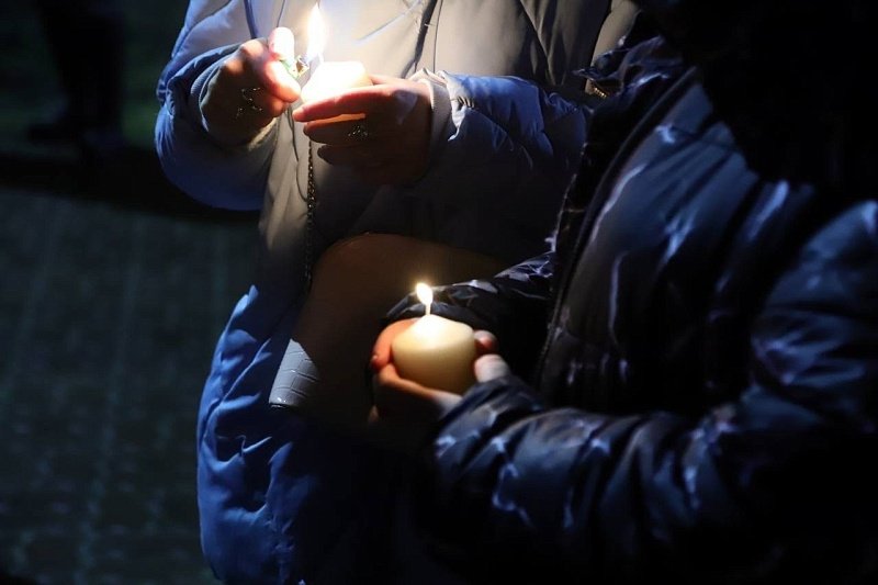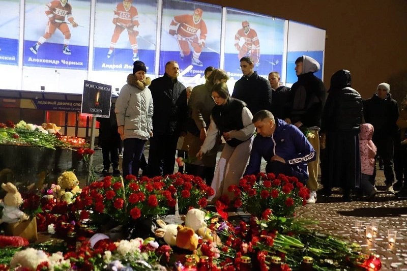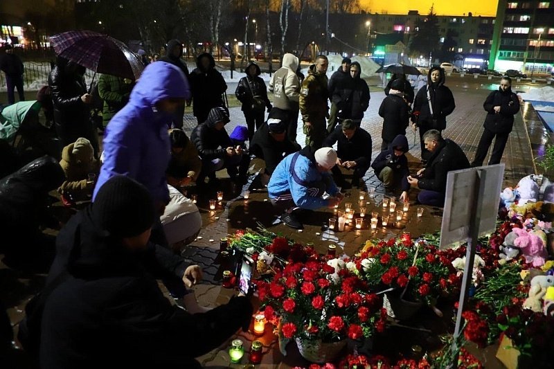 Весь день жители города шли к стихийному мемориалу, приносили цветы, свечи, игрушки. На всех учреждениях приспущены национальные флаги.