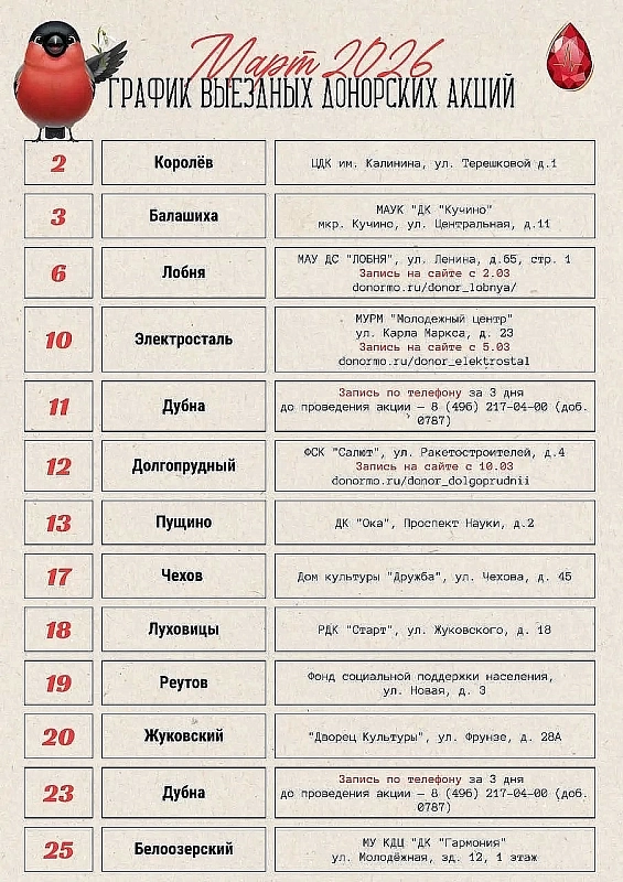 25 марта Московский областной центр крови проведет выездную донорскую акцию в городе Белоозерский г. о. Воскресенск. Сдать кровь можно будет с 9:00 до 12:00 по адресу: г. Белоозерский, ул. Молодежная, д.12.