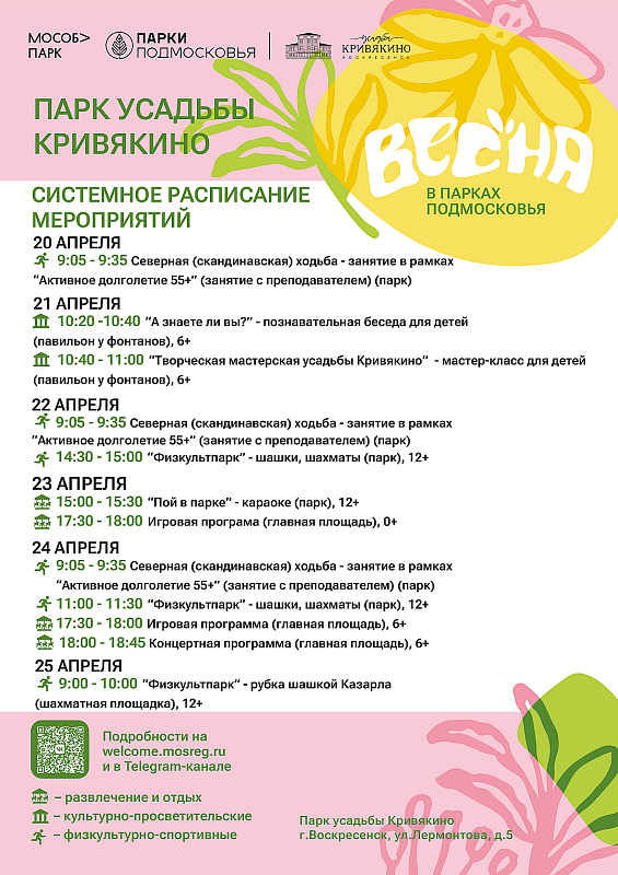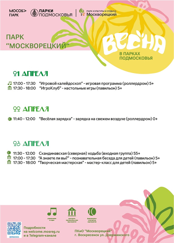 17.04.2026 10:10:00 59 Парки Воскресенска приглашают на мероприятия с 20 по 26 апреля 2026 года. Подробности читайте в афишах. ФОТО: Администрация г.о. Воскресенск