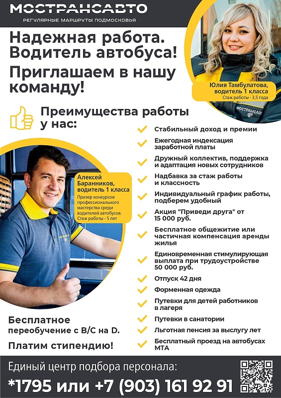 Новым водителям предоставляется заработная плата от 90 тысяч рублей в месяц, стимулирующая выплата в 50 тысяч рублей при трудоустройстве, компенсация 12 тысяч рублей за найм жилья и полный социальный пакет.