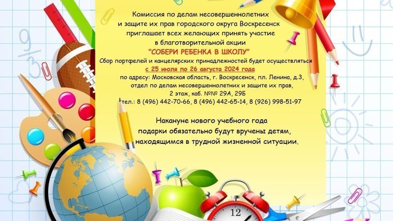 Комиссия по делам несовершеннолетних и защите их прав городского округа Воскресенск приглашает всех желающих принять участие в благотворительной акции «Собери ребёнка в школу».