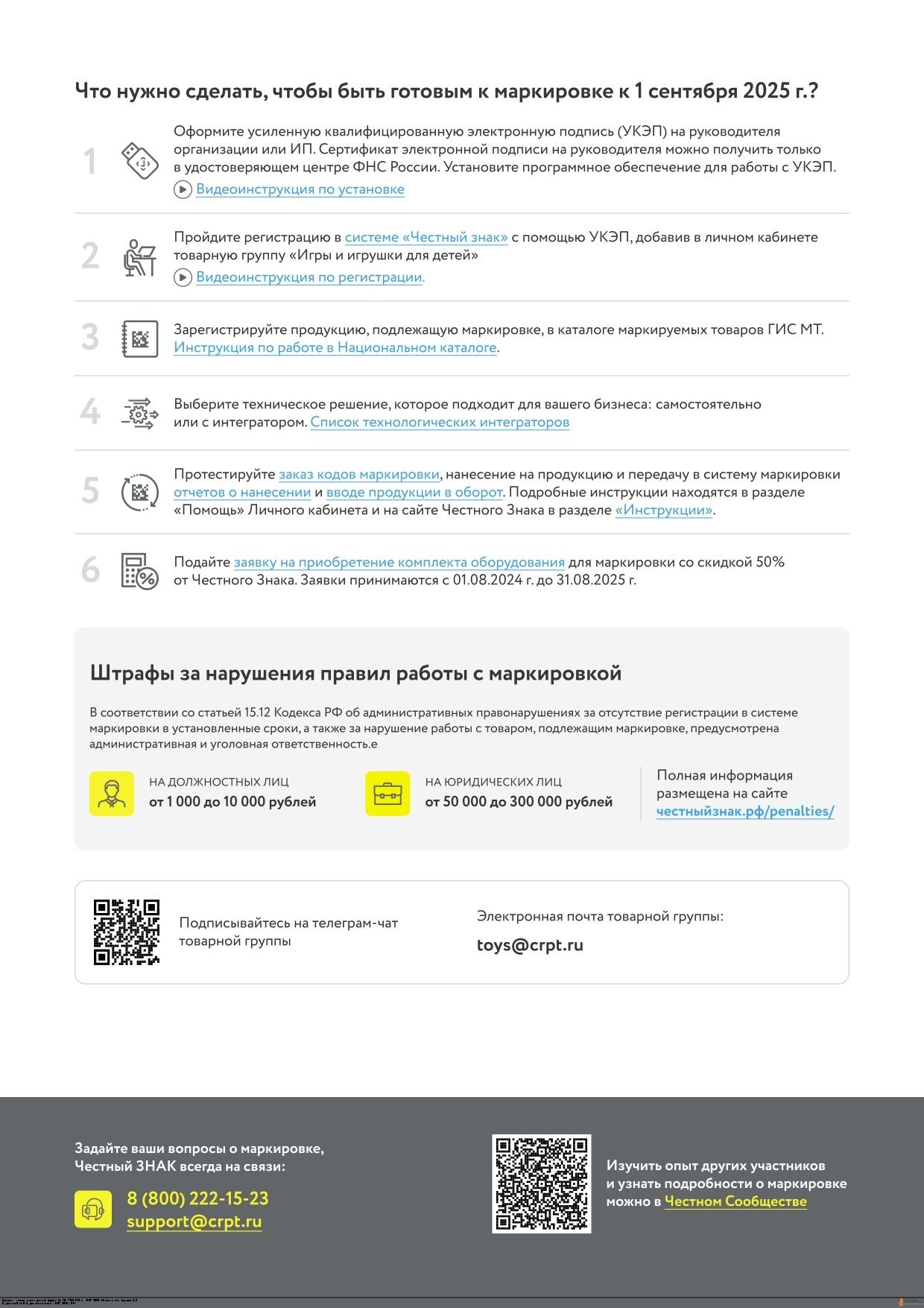 Дополнительно сообщаем, что на сайте честныйзнак.рф в информационнотелекоммуникационной сети «Интернет» размещена справочная информация о правилах регистрации и работе в информационной системе маркировке, которая доступна по адресу: https://честныйзнак.рф/business/projects/children/.