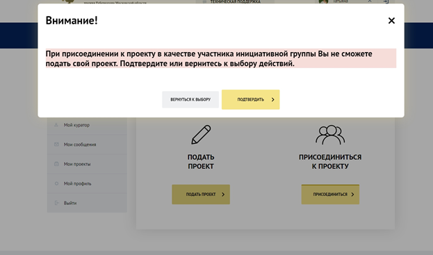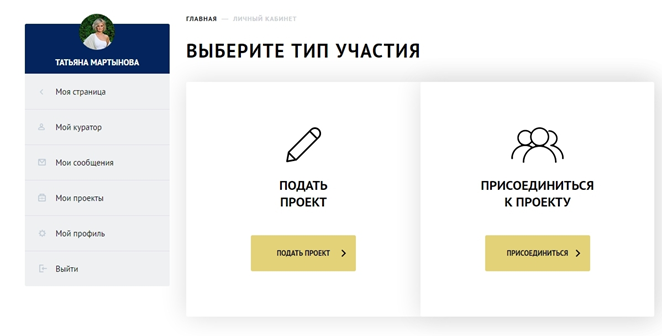 Далее будет предложено выбрать тип участия «Подать проект» или «Присоединиться к проекту».