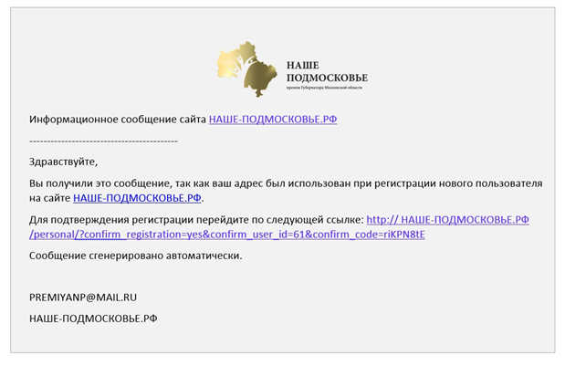 Пример поступившего на электронную почту письма. Необходимо пройти по ссылки для подтверждения регистрации.