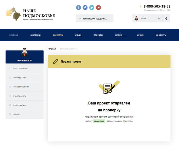 После того, как проект будет одобрен, в вашем профиле появится иконка «Одобрено».