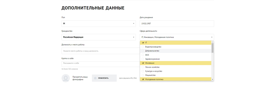 Из выпадающего списка «Сфера деятельности» можно выбрать несколько предлагаемых вариантов.