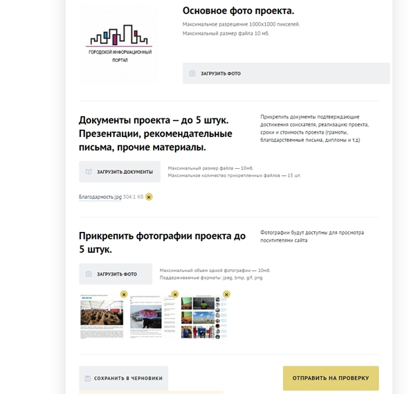 Загрузите фото проекта и дополнительные материалы. Прикрепите фотографии проекта. Не проходите этот шаг – наличие фото-подтверждения реализации проекта очень важно для рассмотрения Вашего проекта Советом по присуждению премии.
